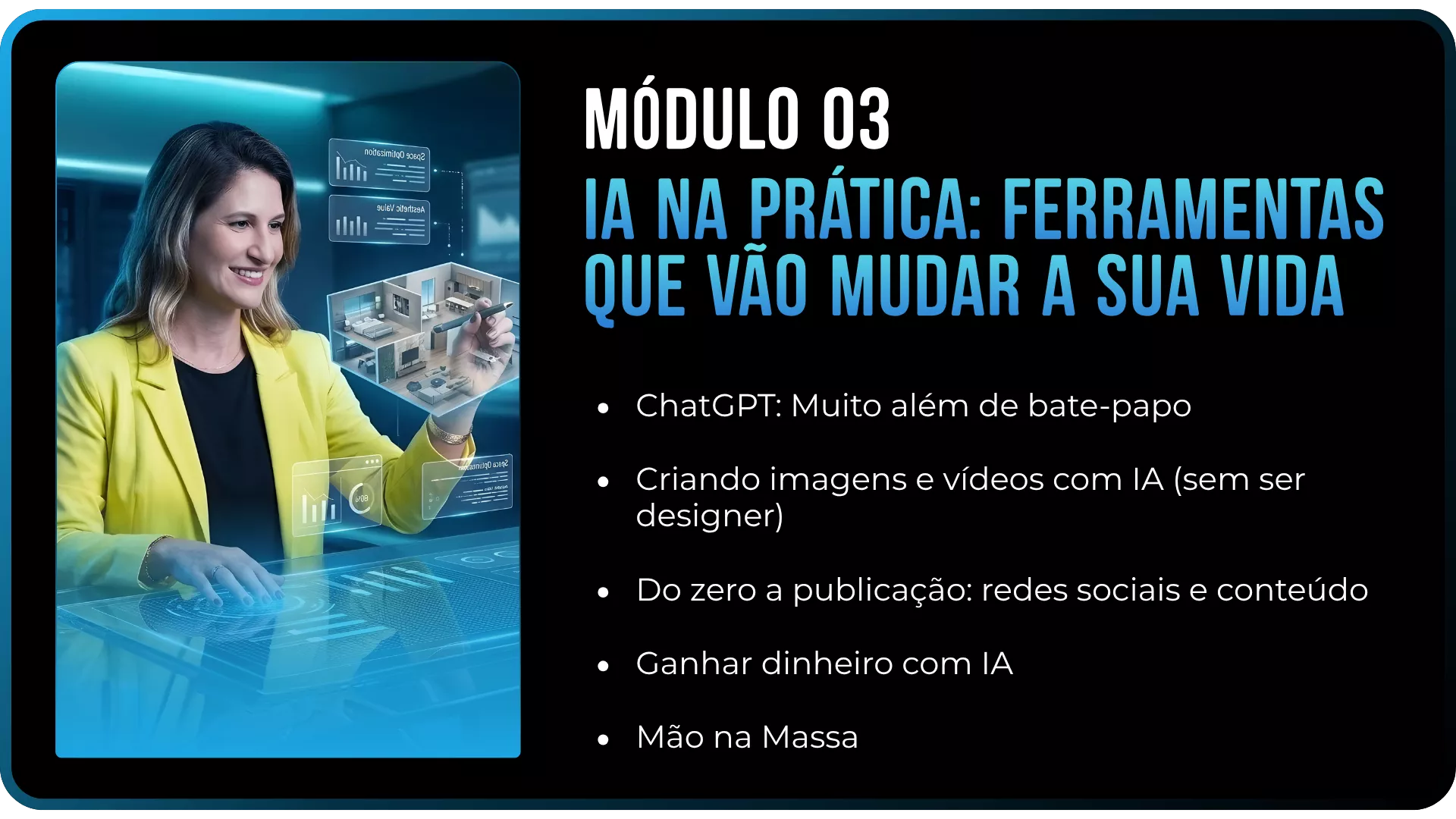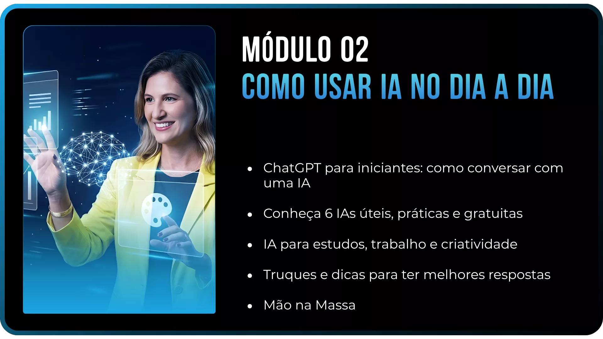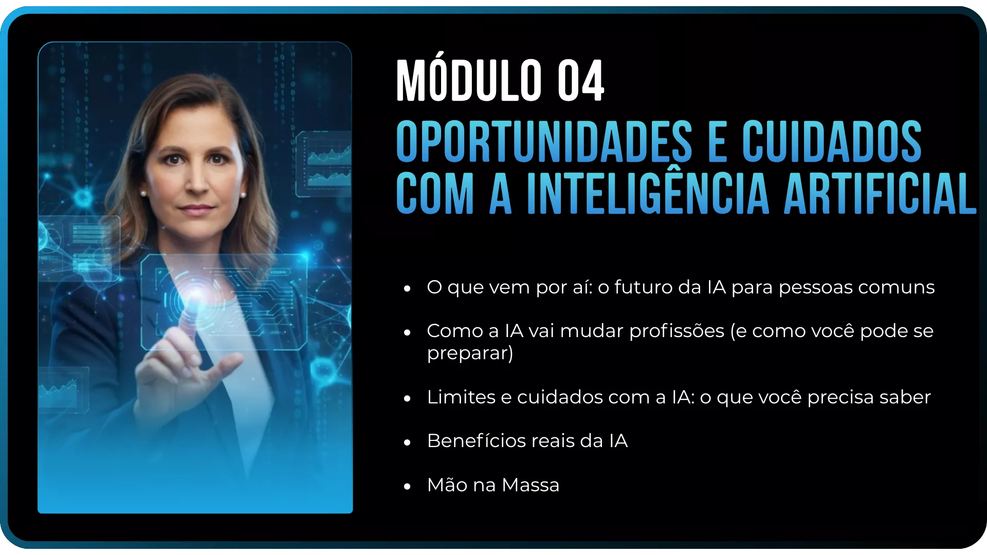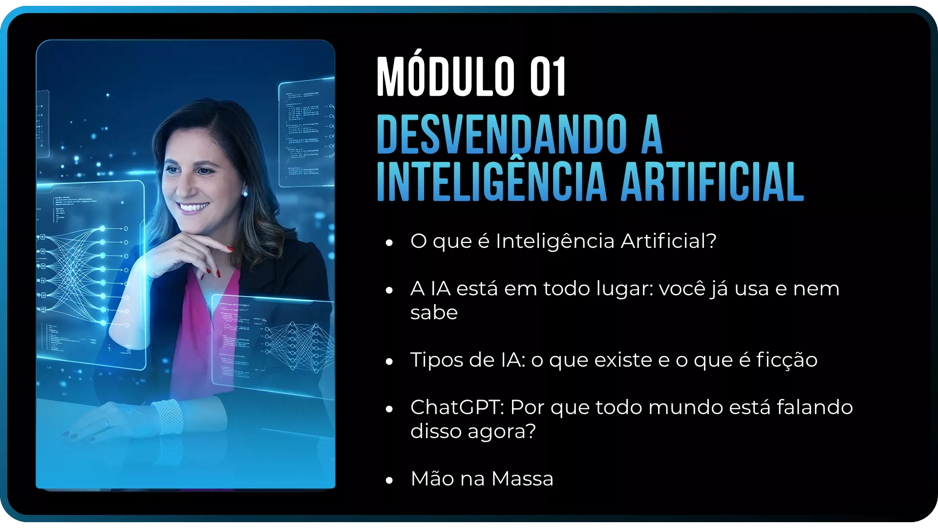 Ao longo de 4 módulos principais, você vai aprender desde os conceitos básicos até aplicações práticas que podem transformar sua produtividade, criatividade e forma de trabalhar.